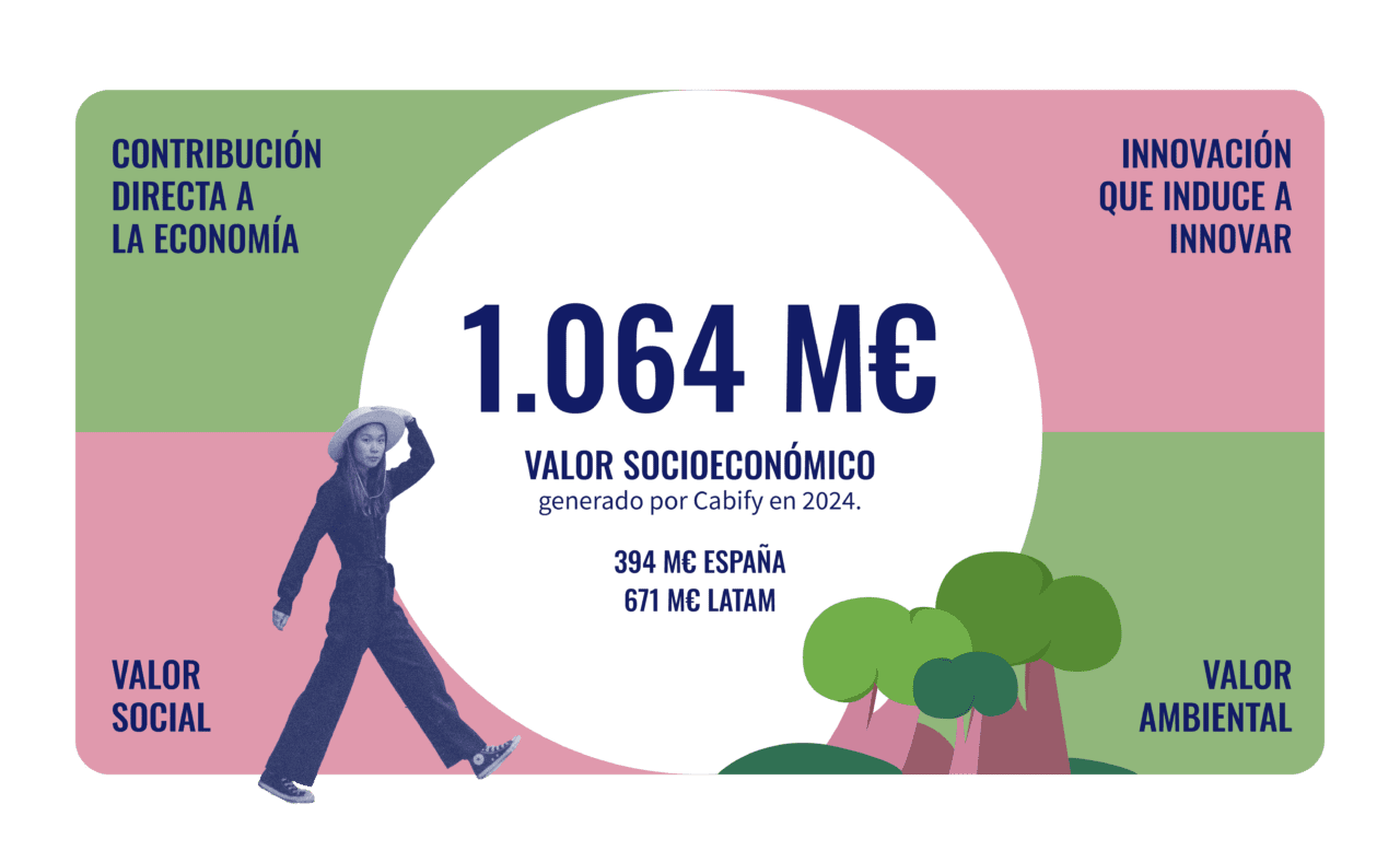 Más allá del rendimiento financiero directo, la metodología también valora el impacto socioeconómico total generado por la compañía. En 2024, el valor agregado estimado asciende a 1.064 millones de euros, con dos tercios generados en Latinoamérica. Esta cifra engloba tanto la contribución económica directa —empleo, facturación de conductores y flotas, proveedores locales, contribución fiscal— como el valor inducido y el impacto social y ambiental. Cabify, además, actúa como semillero de innovación: más de 90 startups han sido fundadas por exempleados, y las alianzas tecnológicas en materia de electrificación y energía han impulsado el ecosistema emprendedor en varios mercados.