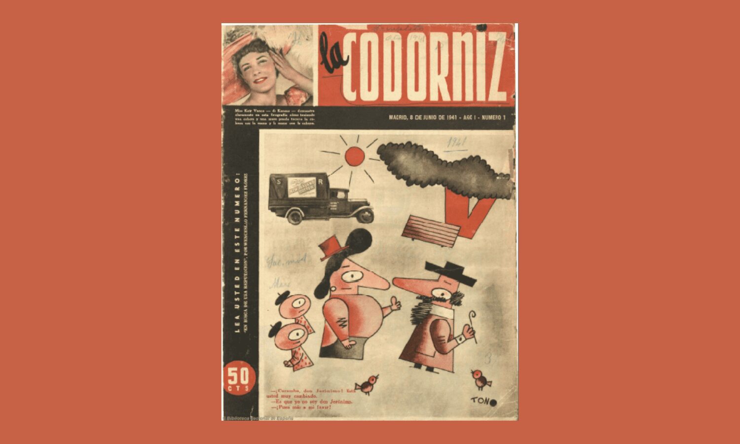 Un caballero se acerca a la ventanilla. «Deme un billete para Vigo». «¿Ida y vuelta?», le responde el taquillero. «No. Vuelta nada más. No me voy». Humor blanco, lindando con el absurdo, surrealista, intemporal, altísimo, disparatado, delirante, también crítico, en la medida que pasaba el lápiz rojo del censor de turno. El de La Codorniz, una de las revistas más notables del periodismo español. La portada príncipe se imprimó en 1941, un 8 de junio de 1941 (festividad de san Medardo y san Clodulfo, también de Fortunato, Gildardo de Rouen, Sabiniano, Salustiano y Calíopa). En plena noche del franquismo. Dieciséis páginas. El dibujo de cubierta era obra de Antonio de Lara, Tono, y el diseño de Enrique Herreros. Se vendieron 35.000 ejemplares, a 50 céntimos.