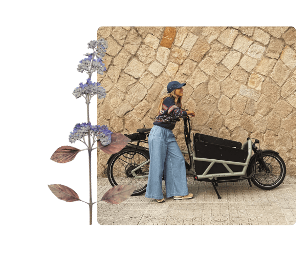 L.G Mi marido, como buen alemán, aprendió a ir en bici antes que a caminar. Yo, en cambio, me incorporé a la vida en bici a los 25 años, en Hamburgo, una ciudad muy bike-friendly. En 2010 nos mudamos a San Sebastián, donde empezamos nuestro proyecto de marca, y me traje conmigo ese estilo de vida. Debo haber sido de las pocas personas que se movían en bici en esa ciudad y, al tener tanta pendiente (en esa época aún no se veían e-bikes), fue todo un reto. En Barcelona (2013) intenté mantener ese hábito, pero me resultó aún más difícil. La ciudad no estaba preparada y solo podía circular por la calzada. Las motos me daban miedo. Después de presenciar un accidente mortal justo delante de mí, decidí dejar la bici y moverme únicamente en transporte público. Diez años después, probé una e-bike de R&M. Me costó un año decidirme, pero Barcelona ha cambiado mucho: hay más carriles bici, más conciencia y mucha más gente moviéndose de forma sostenible. Finalmente me animé… ¡y desde entonces no me bajo de la bici! Además, desde que tengo la e-bike rara vez uso transporte público… ¡hasta creo que me estoy olvidando de conducir el coche! Muchas veces salimos mi marido y yo por la noche y vamos ambos en la bici cargo, eléctrica por supuesto.
